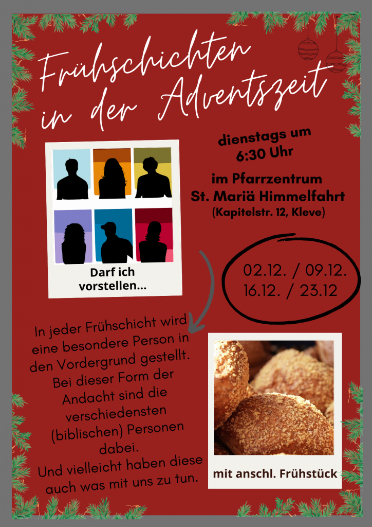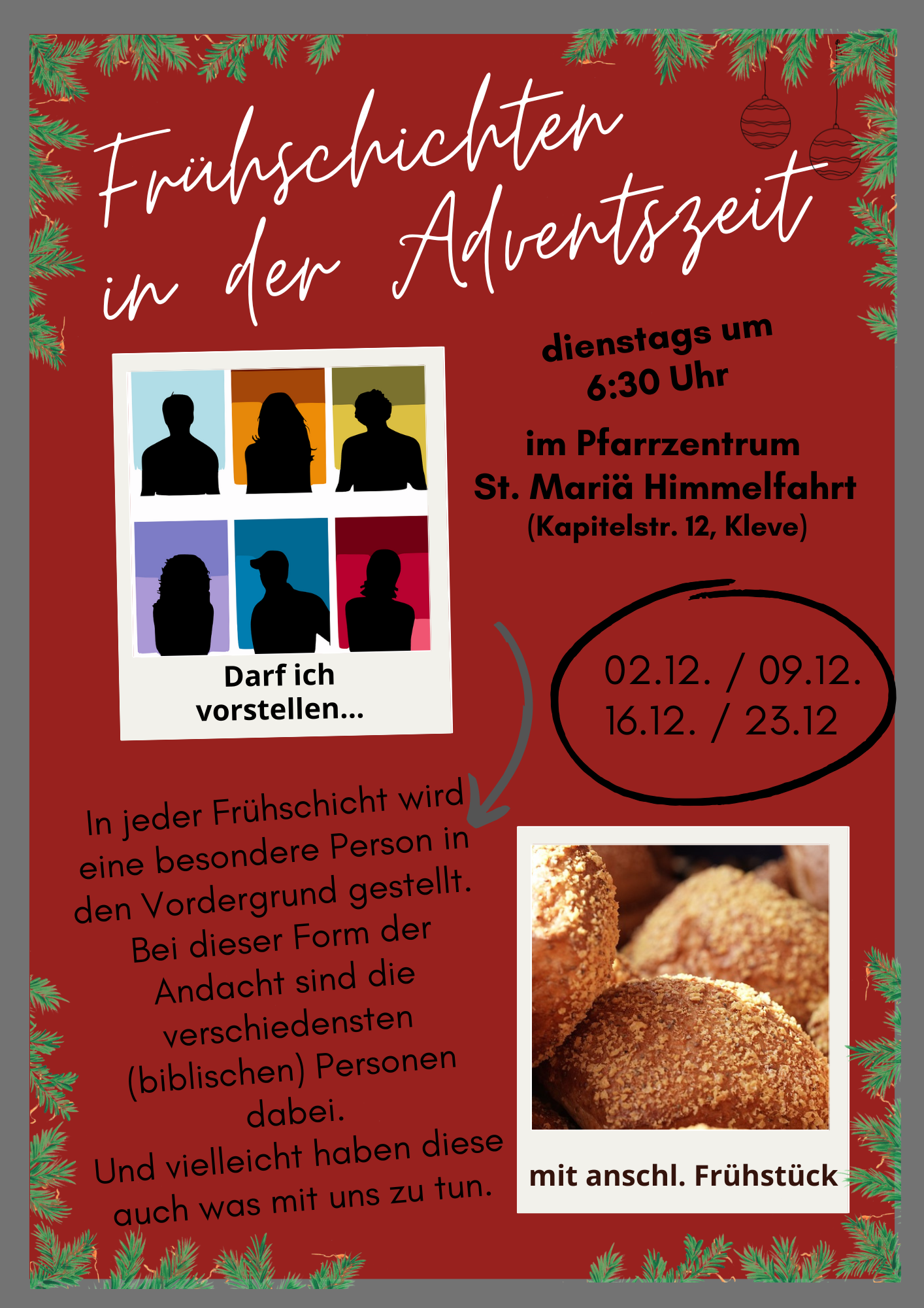 Die Frühschichten sind an den folgenden Terminen geplant: 02.12., 09.12., 16.12., 23.12. Dabei wird in jeder Andacht eine besondere Person in den Vordergrund gestellt, die entweder aus der Bibel stammt oder eine andere spirituelle Bedeutung hat.