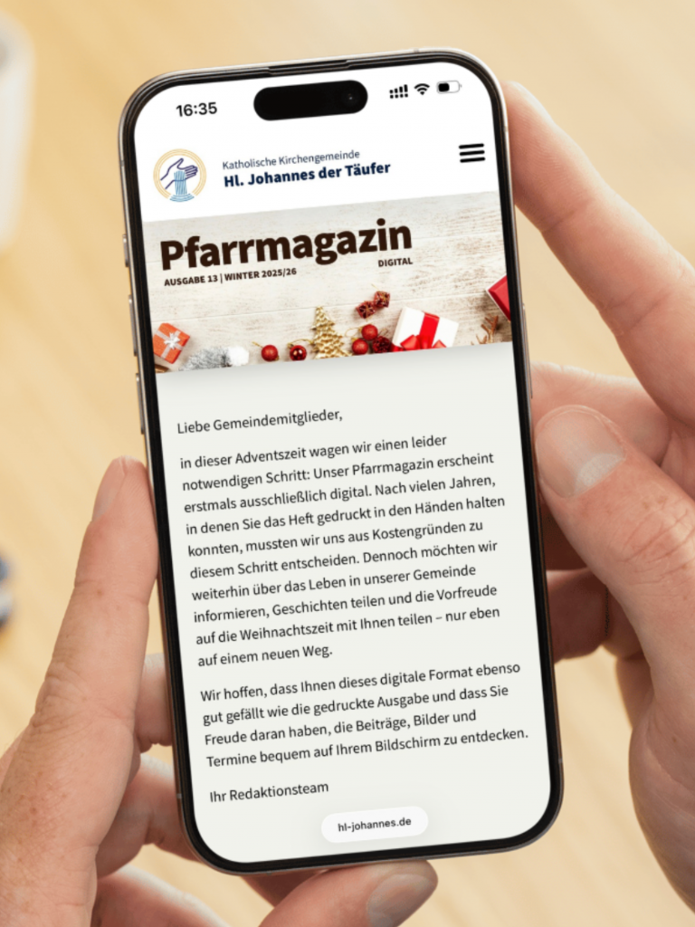 Das aktuelle Pfarrmagazin der Pfarrgemeinde Hl. Johannes der Täufer verbindet besinnliche Impulse mit lebendigen Einblicken ins Gemeindeleben. Berichte aus den Kindergärten, spannende Projekte der Fördervereine und viele Mitmachmöglichkeiten machen es zu einem inspirierenden Begleiter für die Vorweihnachtszeit.